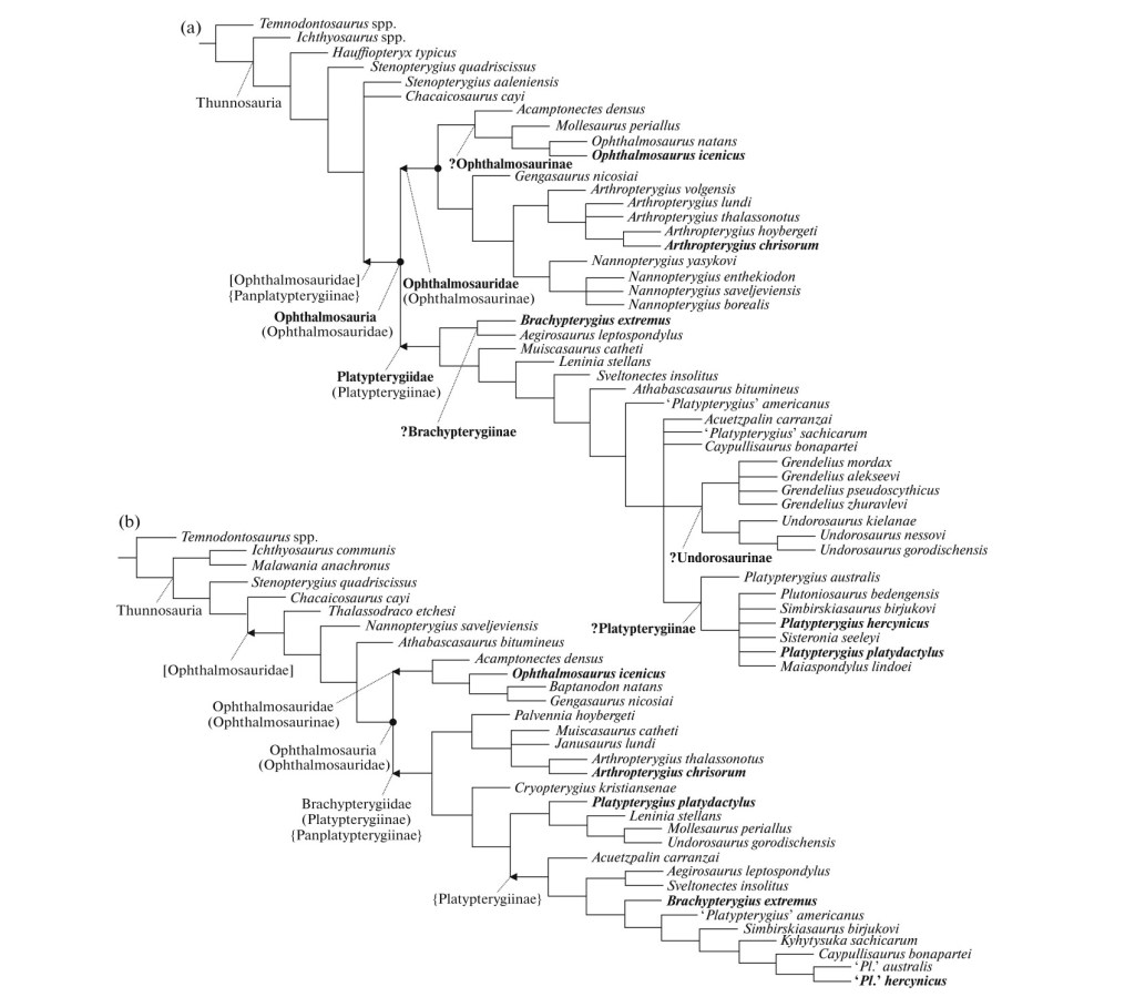 Pour restaurer une phylogénie cohérente, Zverkov a privilégié la phylogénie (Ophthalmosauria (Opththalmosauridae + Platypterygiidae)), en synonymisant Panplatypterygiinae à Ophthalmosauria ainsi que Brachypterygiidae et Undorosauridae à Platypterygiidae. Il a toutefois souligné que ces deux derniers noms peuvent être déclinés en sous-familles ou en tribus (Undorosaurinae, Brachypterygiinae…) lors de nouvelles analyses phylogénétiques des Ophthalmosauria.