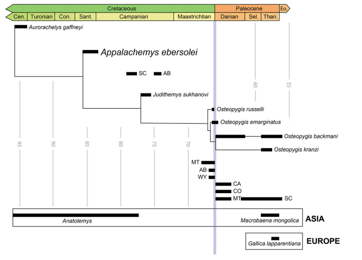 En 1985, D. E. Jones découvre la carapace d’une grande tortue provenant des niveaux Santonien-Campanien de la formation géologique de Mooreville Chalk (Alabama, USA). En 2015, Harrell et Pérez-Huerta mentionnent le spécimen dans la littérature scientifique comme un squelette de tortue provenant d’une formation géologique inconnue. Ce spécimen (ALMNH PV985.24) a été désigné comme holotype du nouveau genre Appalachemys (en référence à Appalachia, une masse continentale située à l’Est des Etats-Unis au Crétacé, où vivait Appalachemys) par Gentry et ses collègues avec pour espèce A. ebersolei.