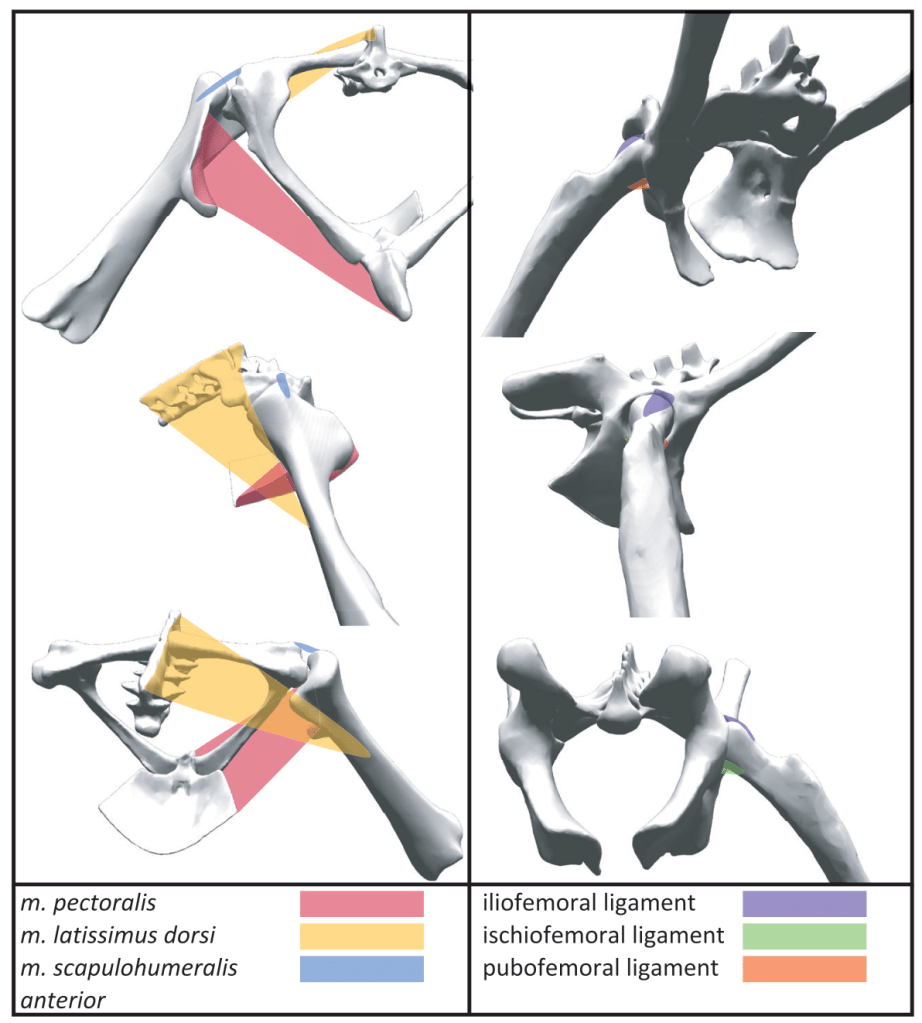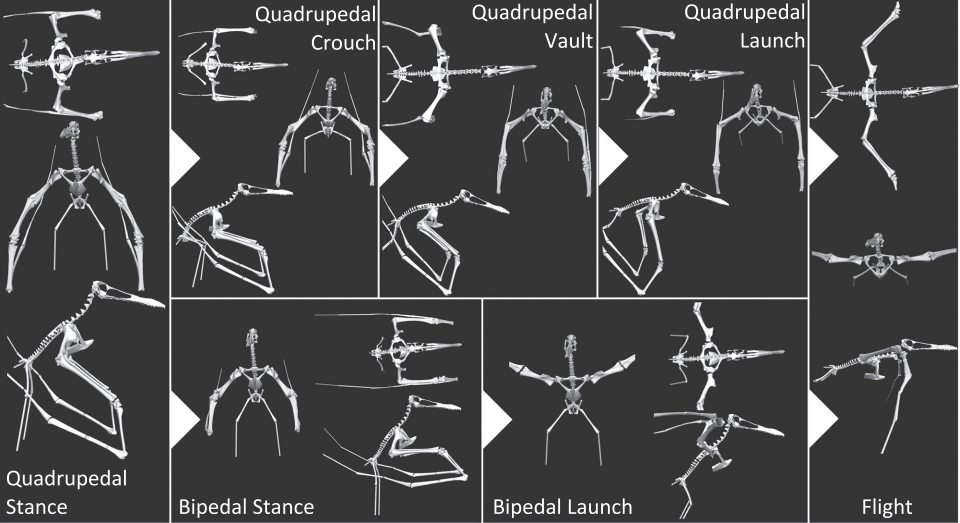 Il faut savoir que notre compréhension de la biomécanique de ces deux hypothèses de lancement est limitée. Il existe de nombreux sites d’empreintes de ptérosaures montrant des scènes de locomotion terrestre, de natation ou encore d’atterrissages mais aucun présentant un décollage. Pour compenser ce manque de preuves, étudier le décollage des ptérosaures nécessite une étude de l’amplitude des mouvements (range of motion en anglais = ROM). Toutefois ces études nécessitent des spécimens bien articulés avec une bonne connaissance des points de dislocation des os, ce qui est très rare chez les ptérosaures. C’est pour pallier à ce manque que Griffin et ses collègues ont mis au point une technique d’analyse de ROM avec la technologie 3D. Ce modèle permet de tester le ROM des hanches et des épaules y compris avec l’ajout de tissus mous comme le cartilage, les ligaments ou les muscles.