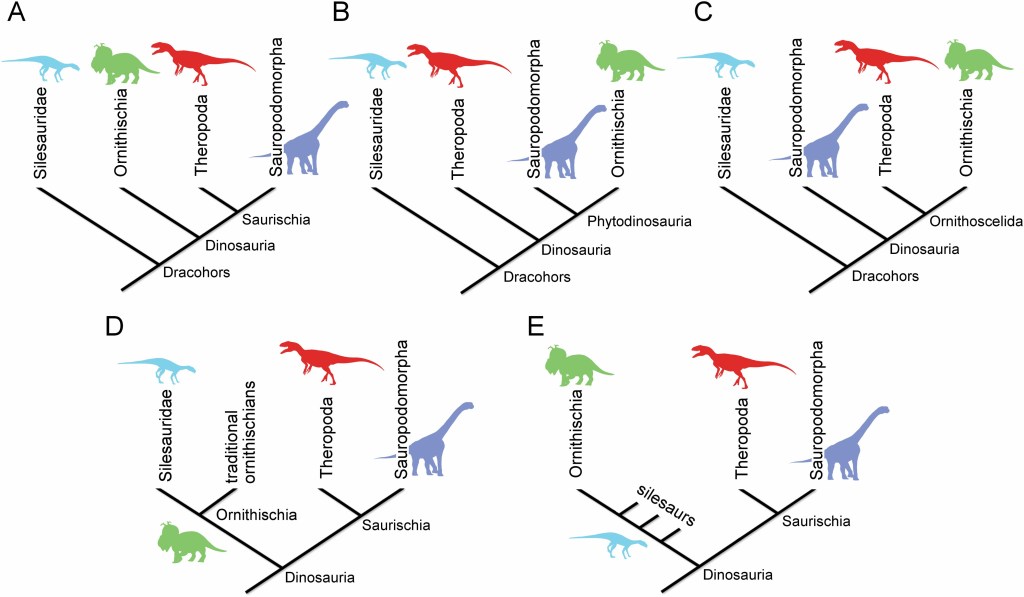 L’hypothèse de classification des dinosaures longtemps privilégiée est celle d’une division en deux groupes : Saurischia et Ornithischia (Seeley, 1888). Quelques hypothèses de classifications alternatives ont vu le jour avec la création de Phytodinosauria (Ornithischia + Sauropoda), les théropodes étant alors des dinosaures basaux (Bakker, 1986). Récemment, Baron et ses collègues ont proposé une nouvelle classification en 2017, avec les sauropodomorphes en dinosaures basaux et les théropodes et ornithischiens en groupes sœurs, ressuscitant le nom d’Ornithoscelida pour ce clade. Toutefois les études phylogénétiques les plus récentes s’accordent avec le modèle Saurischia-Ornithischia de Seeley. Il a également été suggéré que les silesauridés, un groupe généralement classé comme des dinosauromorphes proches des dinosaures, soient en réalité des Ornithischiens basaux ou le groupe sœur de ceux-ci.
