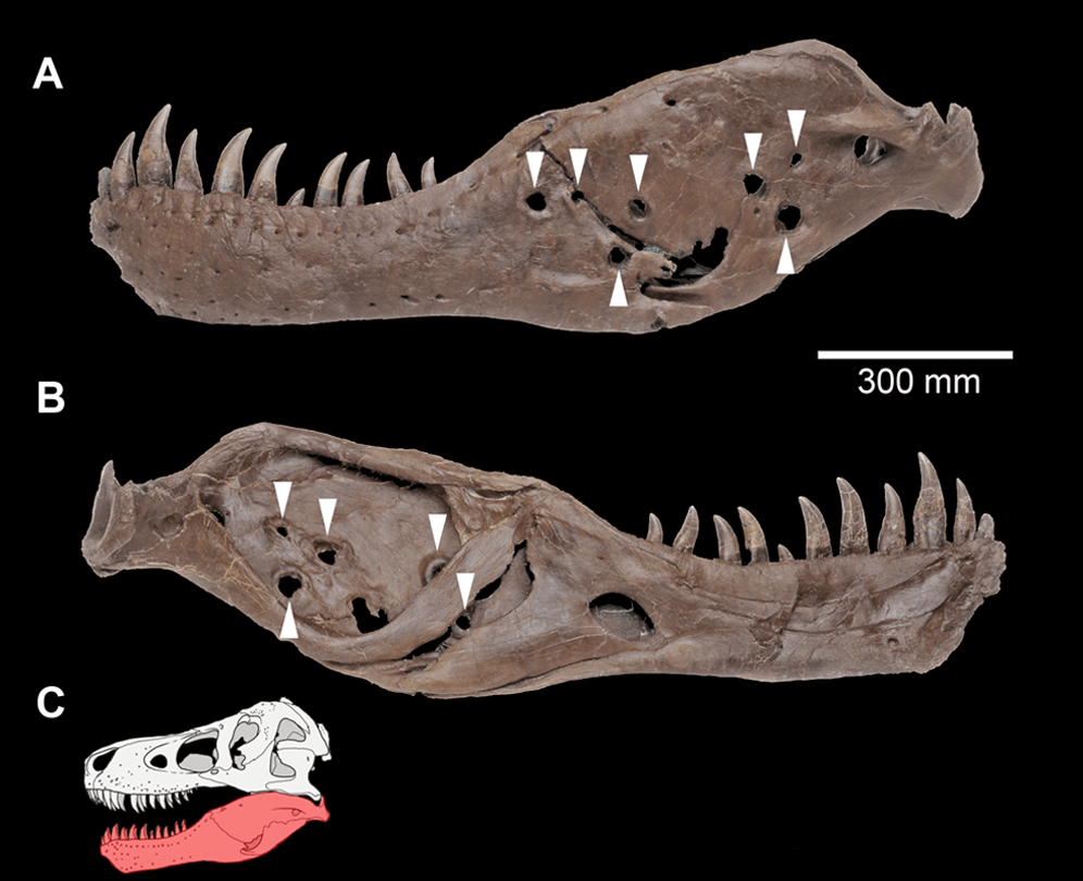 Références : Rothschild, B.; O’Connor, J.; Lozado, M.C., 2022, Closer examination does not support infection as cause for enigmatic Tyrannosaurus rex mandibular pathologies. Cretaceous Research. 105353