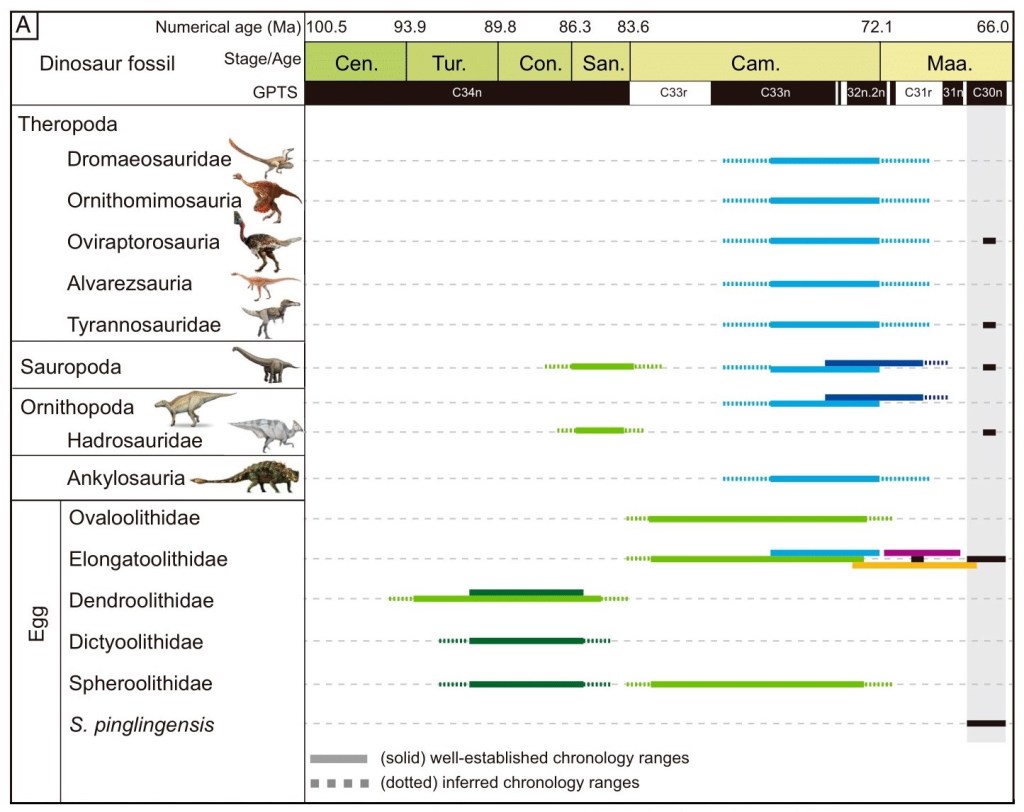 Les œufs retrouvés appartiennent à des hadrosaures et à des oviraptorosaures. Han et ses collègues remarquent que l’occurrence de fossiles d’œufs diminue au fil du temps, par un biais biologique plutôt que taphonomique au vu des conditions de dépôt idéales. Les dinosaures de la formation géologique de Shanyang comprennent : des sauropodes (Qinlingosaurus), des hadrosaures (Shantungosaurus), des oviraptorosaures (Shanyangosaurus) et des tyrannosauridés. Cette composition faunique traduit un déclin de plusieurs groupes de théropodes puisque les troodontidés, les alvarezsauridés, les dromaeosauridés et les tyrannosauridés sont pas ou beaucoup moins représentés qu’au Campanien supérieur-Maastrichtien inférieur. Les hadrosaures observent quand à eux un déclin beaucoup plus lent. Cette question de déclin des théropodes durant le Maastrichtien s’observe à l’échelle mondiale d’après Han et ses collègues mais selon d’autres études la diversité des dinosaures ne baisse pas durant cette période. Cela peut s’expliquer par les méthodes d’analyses diverses utilisées, les biais d’échantillonnage ou encore la datation des fossiles.