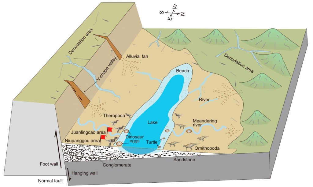 Le bassin de Shanyang correspond à une zone inondable protégée par un pan de falaise, avec des systèmes de lacs, de méandres ou de rivières tressées en fonction de l’époque. Ces conditions environnementales offrent un cadre idéal à la fossilisation. Pour établir un cadre géochronologique du site, des études magnétostratigraphiques, cyclostratigraphiques et biostratigraphiques ont été réalisées par Han et ses collègues. Ils ont étudié une grande quantité de coquilles d’œufs de dinosaures associées à de nombreux restes d’os de sauropodes, ornithopodes et théropodes retrouvés dans Maastrichtien supérieur (68 à 66 MA) du bassin de Shanyang.