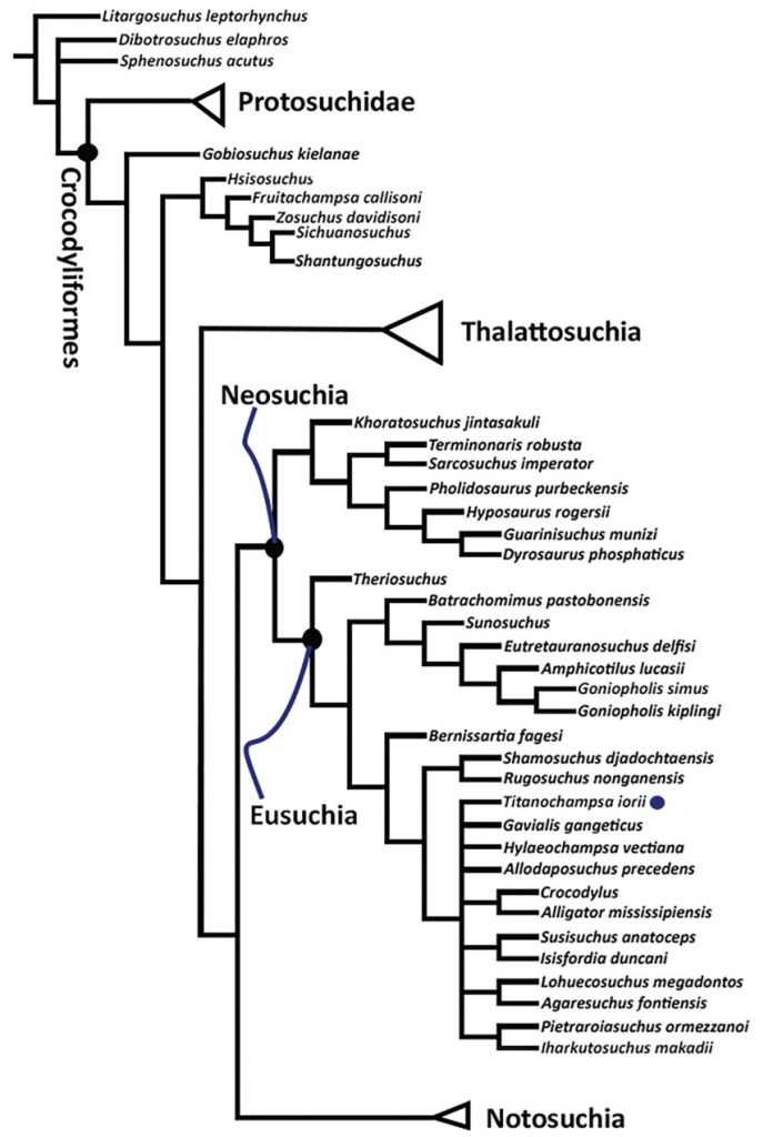 L’analyse phylogénétique de Fachini et ses collègues place Titanochampsa au sein des eusuchiens, dans une position indéterminée. Toutefois, au vu de la nature fragmentaire des restes connus du genre, ils préconisent de le considérer au moins comme un neosuchien potentiel et plus prudemment comme un mesoeucrocodylien indéterminé. Leur seule certitude majeure est que Titanochampsa n’est pas un notosuchien, ce qui est surprenant puisque jusque là les seuls grands crocodylomorphes du crétacé supérieur sud-américain étaient des membres de ce clade.