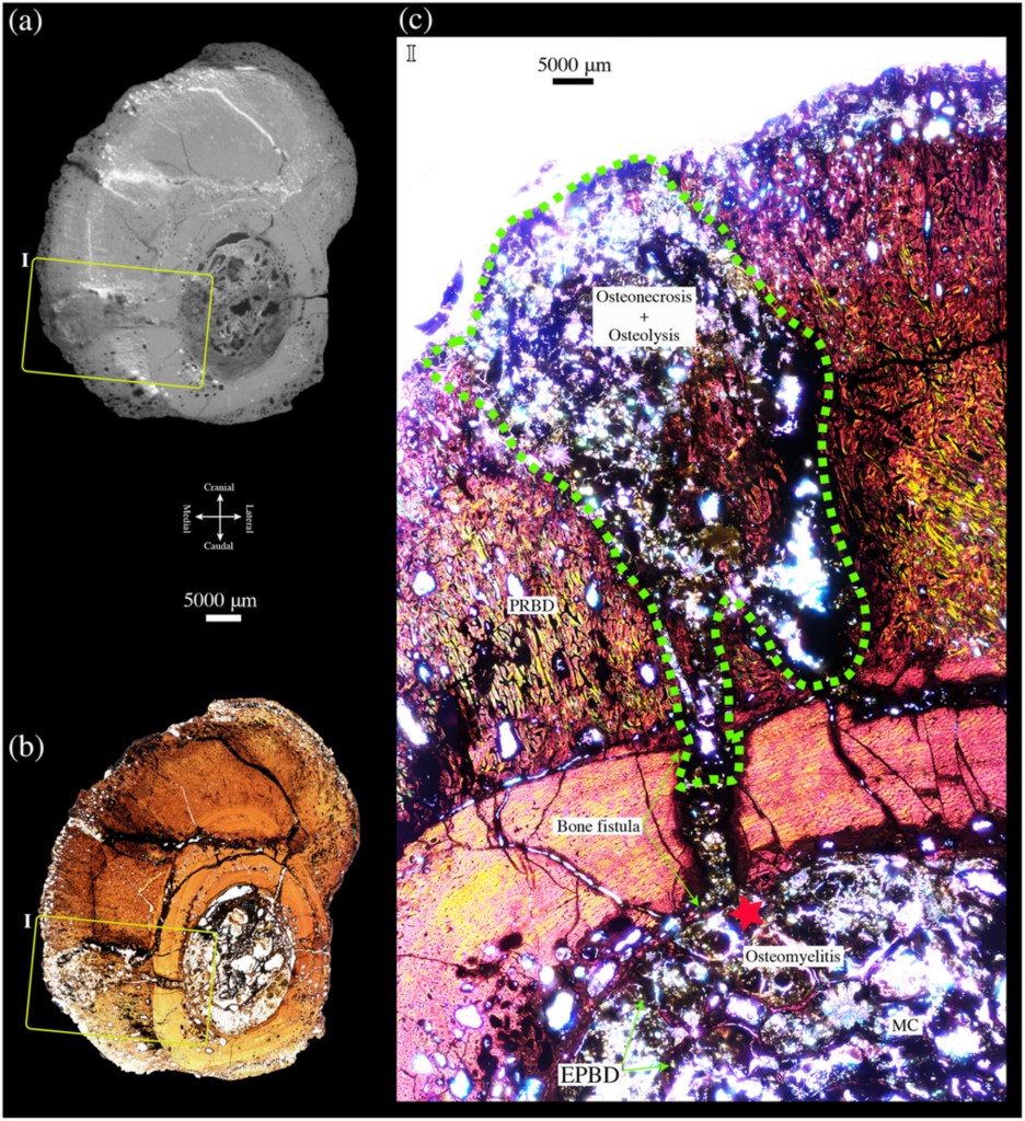 Références : Chinzorig, T.; Beguesse, K.A.; Canoville, A.; Phillips, G.; Zanno, L.E., 2022, Chronic fracture and osteomyelitis in a large-bodied ornithomimosaur with implications for the identification of unusual endosteal bone in the fossil record. The Anatomical Record. 1–16.
