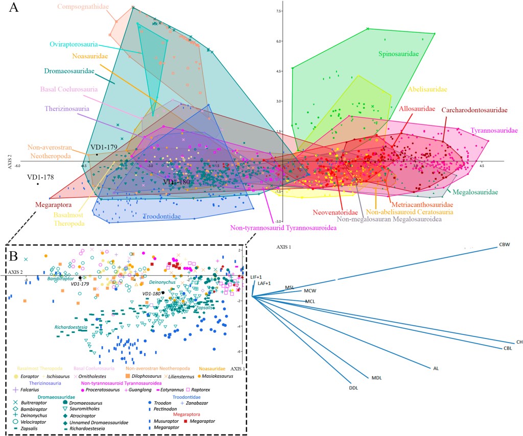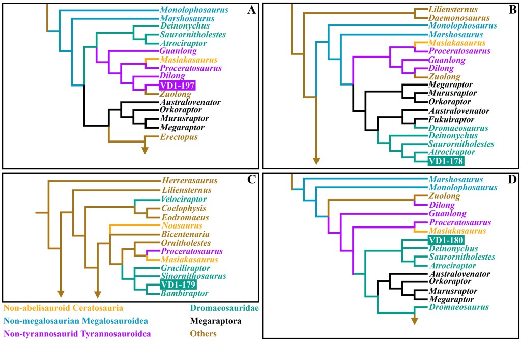 L’analyse phylogénétique a placé VD1-197 comme un tyrannosauroidé non-tyrannosauridé, toutefois le clade a aussi inclus le coelurosaure basal Zuolong, ce qui invite à la prudence quand à cette assignation, tandis que VD1-178, VD1-179 et VD1-180 ont été placés chez les dromaeosauridés. L’analyse morphométrique rapproche VD1-178, VD1-179 et VD1-180 des morphologies dentaires des dromaeosauridés, parfois aussi de celles des Megaraptora, des Tyrannosauroidea ou des Troodontidae.