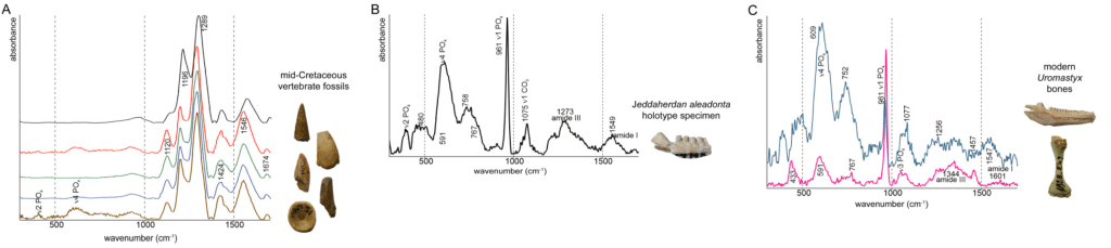 Les spectres de Raman pour les dents et la vertèbre de Gara Tabroumi sont tous similaires entre eux mais sont très différents de ceux des os d’Uromastyx et de l’holotype de Jeddaherdan aleadonta. En revanche, les spectres de Raman des os d’Uromastyx et de l’holotype de J. aleadonta sont assez similaires. La composition moléculaire de MNHN.F.MRS51.1 ainsi que du dentaire d’Uromastyx (qui est un spécimen archéologique) est similaire et suggère que l’os a été recrystallisé. Cet état de conservation apparaît comme typique des os du Quaternaire. Le résultat de la spectroscopie Raman montre que l’holotype de J. aleadonta ne provient pas de la formation géologique de Kem Kem et représente plutôt un spécimen archéologique.