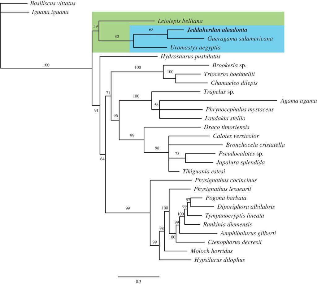 En 2016, Apesteguia et ses collègues décrivent un nouveau genre de squamate iguanien du Cénomanien de la formation géologique de Kem Kem (Drâa-Tafilalet, Maroc) : Jeddaherdan. L’espèce type est J. aleadonta et se base sur un fragment de dentaire (MNHN.F.MRS51.1). Apesteguia et ses collègues avaient alors classé Jeddaherdan comme un agamidé dans la sous-famille des uromastycinés, en tant que taxon-soeur de Gueragama. Toutefois l’holotype de Jeddaherdan est très similaire aux spécimens du genre actuel Uromastyx vivant dans la zone saharo-arabe. Vullo et ses collègues examinent ainsi le spécimen MNHN.F.MRS51.1 pour savoir s’il s’agit d’un fossile du crétacé ou d’un subfossile récent.