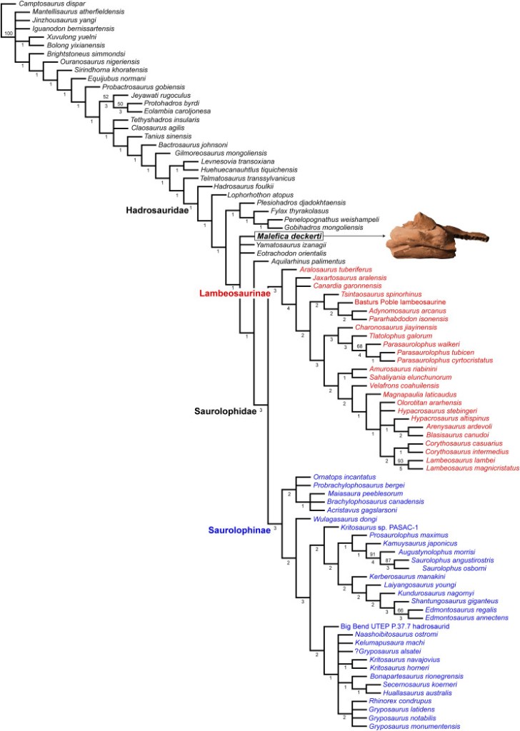 L’analyse phylogénétique de Prieto-Marquez et Wagner a retrouvé Malefica dans une position d’hadrosauridé basal hors de Saurolophinae + Lambeosaurinae (clade qu’ils désignent sous le nom de Saurolophidae, mais ce nom est controversé). Leur analyse a également retrouvé Lophorhothon ainsi qu’un petit clade comprenant Gobihadros, Fylax, Penelopognathus et Plesiohadros au sein d’Hadrosauridae. Ces résultats atypiques sont toutefois à confirmer par de futures études, mais témoignent d’une plus grande diversification des hadrosauridés basaux que celle jusque là suggérée.