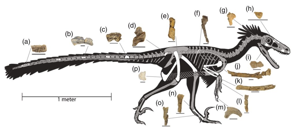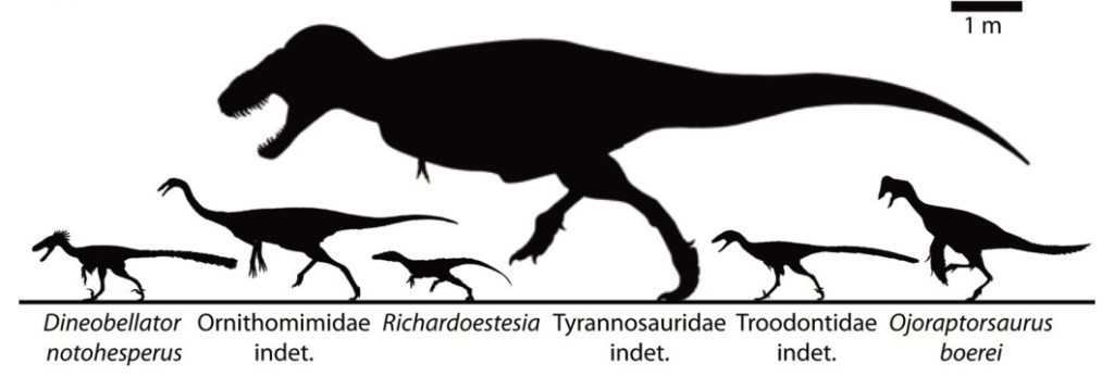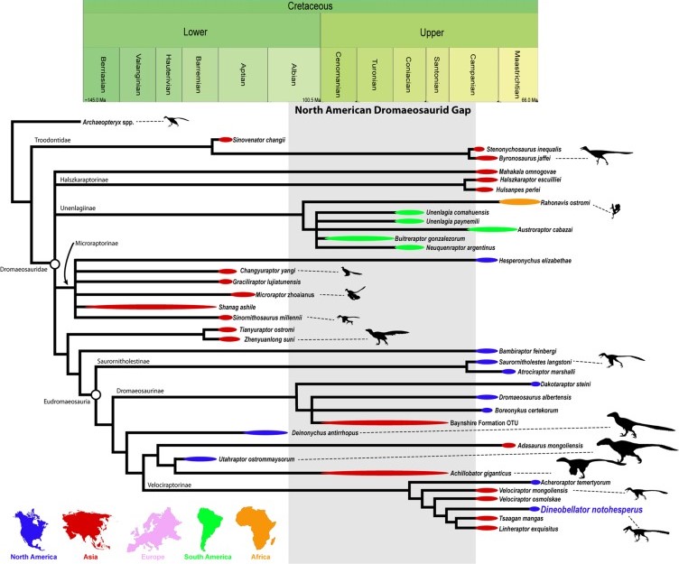 Références : Jasinski, S.E.; Sullivan, R.M.; Carter, A.M.; Johnson, E.H.; Dalman, S.G.; Zariwala, J.; Currie, P. J., 2022, Osteology and reassessment of Dineobellator notohesperus, a southern eudromaeosaur (Theropoda: Dromaeosauridae: Eudromaeosauria) from the latest Cretaceous of New Mexico. The Anatomical Record. 1–45.