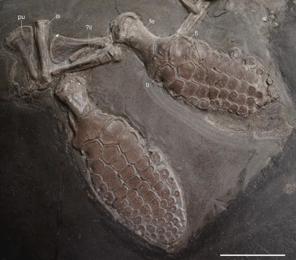 Les membres postérieurs et le bassin sont bien authentiques et forment ensemble un unique spécimen. Lomax et ses collègues ont analysé les caractéristiques de ces os et en ont conclu que ce spécimen pouvait se référer à Ichthyosaurus conybeari. Ce spécimen est d’autant plus important car les caractéristiques du bassin sont légèrement différentes de celles proposées lors de la redescription d’I. conybeari par Massare et Lomax en 2016. En effet ces derniers rapportaient la présence chez cette espèce d’un ischium plus court que le pubis, une morphologie qui n’est pas présente dans le spécimen étudié par Lomax et ses collègues. Selon eux, cela peut s’expliquer par un dimorphisme sexuel, une ontogénèse, une pathologie ou une variation intraspécifique.