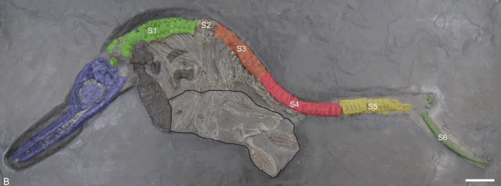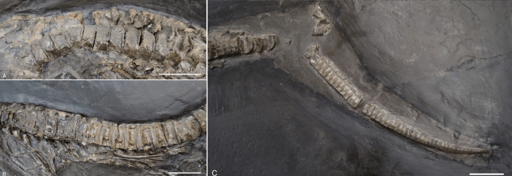 La colonne vertébrale se compose principalement de vertèbres caudales réelles mais appartenant à plusieurs individus et disposées de manière désordonnée. L’absence de caractéristiques anatomiques sur ces vertèbres empêche Lomax et ses collègues d’en déterminer la provenance ou l’indentification. Toutefois au vu des sédiments dans lesquels le squelette est placé et de la couleur de ces os, ces vertèbres pourraient provenir de la formation géologique de Posidonia Shale et appartenir à Stenopterygius. Lomax et ses collègues notent quand même qu’ils ne peuvent exclure la possibilité que ces vertèbres proviennent d’une autre localité et d’un autre genre.
