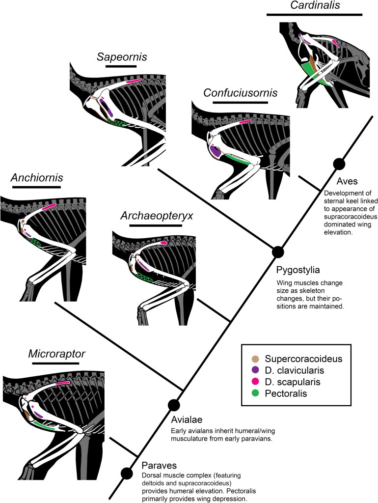 Les Avialae basaux comme Archaeopteryx ou les Anchiornithidae (cette famille peut également être incluse au sein des troodontidés, mais Pittman et ses collègues la placent chez les Avialae) présentent un style de vol employant les mêmes muscles que les dromaeosauridés. Toutefois, ces Avialae basaux ne possèdent pas de sternum, ce qui pourrait s’expliquer par une baisse de stress dû au muscle pectoral. L’analyse des tissus mous d’Archaeopteryx et d’Anchiornis par Pittman et ses collègues va dans ce sens en décelant un muscle pectoral réduit pour ces deux genres. Cette baisse de taille du pectoral peut être liée à une libération de la poitrine pour permettre une meilleure respiration.