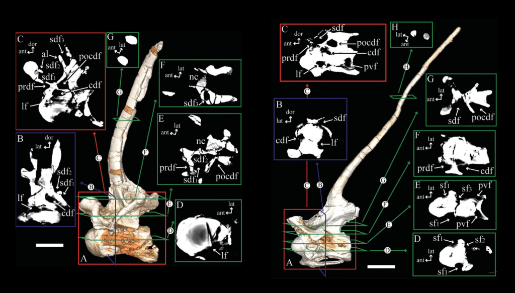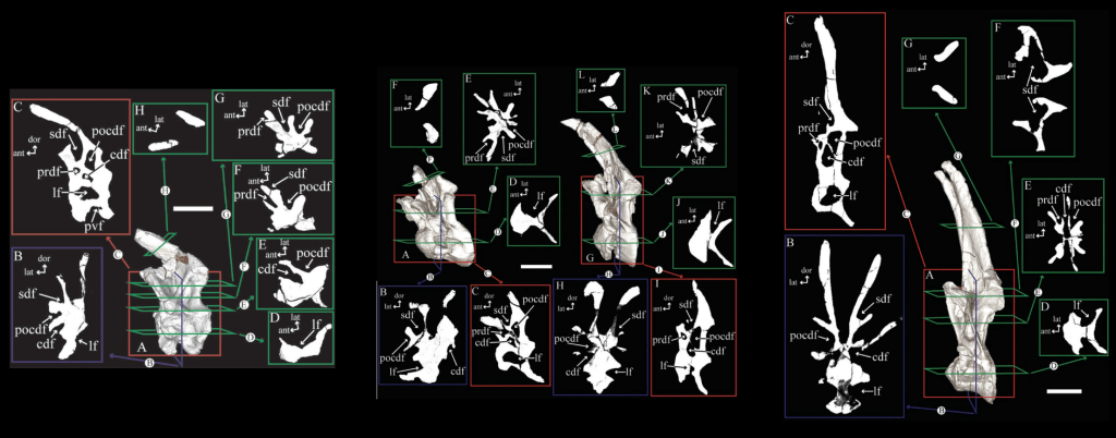 L’étude de Windholz et ses collègues se base sur l’analyse des vertèbres de l’holotype d’Amargasaurus cazaui (MACN PV N15) et de l’holotype de Brachytrachelopan mesai (MPEF-PV 1716). Ces vertèbres ont été scannées au scanner CT pour obtenir un modèle 3D avec les structures internes des vertèbres, y compris la pneumatisation.