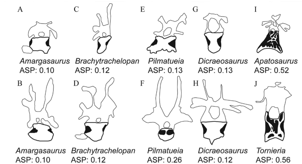 Windholz et ses collègues constatent que les vertèbres de Brachytrachelopan et d’Amargasaurus ont des structures pneumatisées très réduites. Il avait été rapporté que le dicraeosauridé Pilmatueia présentait des foramina au niveau d’une de ses vertèbres dorsales, potentiellement un signe de pneumatisation avancée. Toutefois Windholz et ses collègues préfèrent interpréter ces foramina comme des structures neuro-vasculaires. Windholz et al., 2020 avaient interprété des variations de densité dans les centra cervicaux d’Amargasaurus comme des signes de pneumatisation de ces vertèbres. Windholz et ses collègues préfèrent ici interpréter ces variations comme le témoin de la présence d’un tissu osseux spongieux.