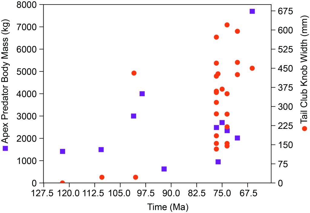 Pour connaître le rôle de la queue en massue des ankylosauridés, Arbour et ses collègues ont testé la relation de corrélation entre la taille de cette massue et celle des prédateurs des ankylosauridés. En effet, une plus grande queue en massue permettrait des chocs plus puissants et donc une meilleure défense contre des prédateurs plus gros. Arbour et ses collègues n’ont toutefois pas retrouvé de relation entre ces deux paramètres, fragilisant le lien entre la queue des ankylosauridés et un rôle défensif contre les prédateurs.