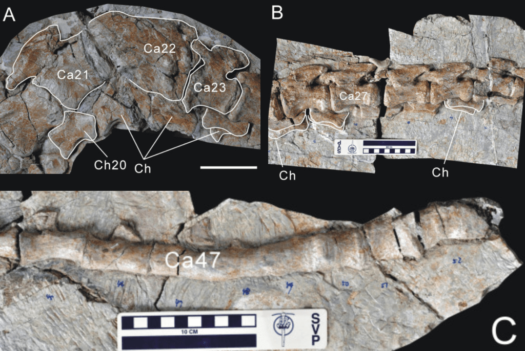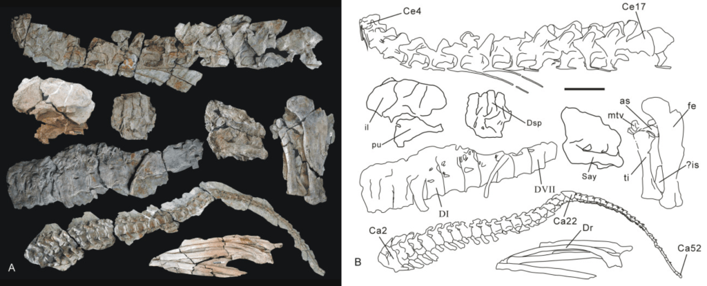 Référence : Mo, J.; Ma, F.; Yu, Y.; Xu, X., 2022, A New Titanosauriform Sauropod with An Unusual Tail from the Lower Cretaceous of Northeastern China. Cretaceous Research. 105449.