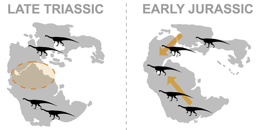 Il a longtemps été proposé que les dinosaures s’étaient propagés à travers le monde en profitant de la disparition d’autres groupes tels que les rauisuchiens ou bien les aetosaures. Toutefois des données récentes ont montré que les dinosaures se sont dispersés pendant un épisode de changement climatique, et que le phénomène de dispersion était encore plus prononcé chez les sauropodomorphes. Dunne et ses collègues ont ainsi analysé statistiquement l’impact climatique sur la dispersion des sauropodomorphes pour savoir si le changement climatique à la limite trias-jurassique en est bien la cause.