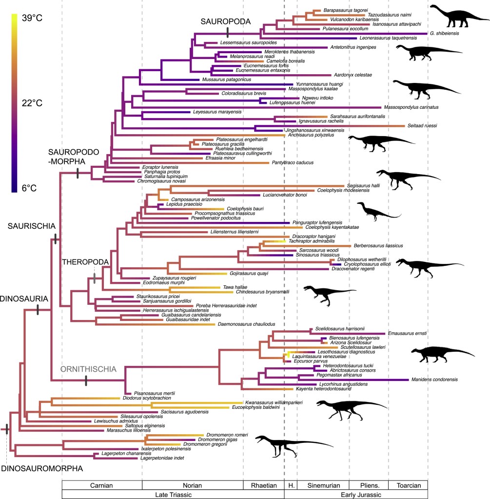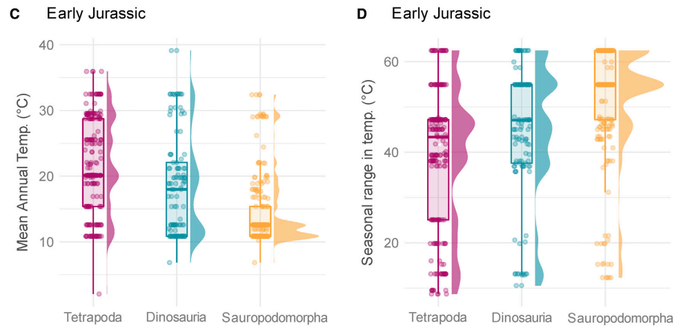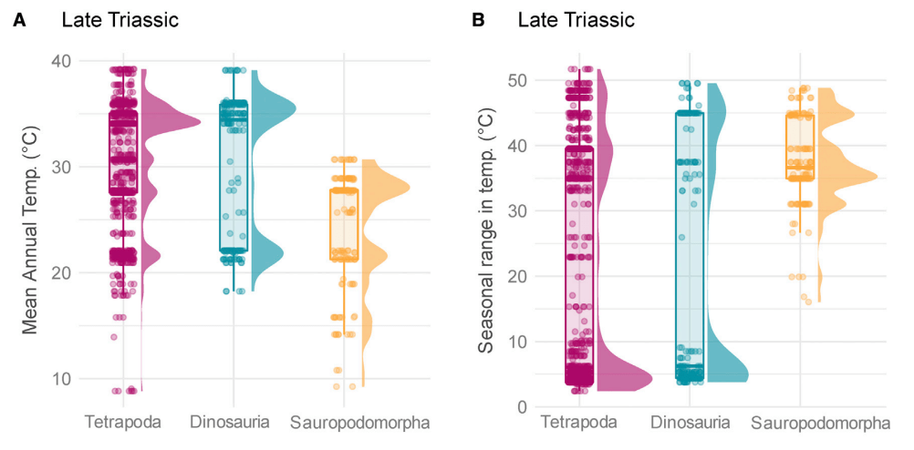 Dunne et ses collègues ont remarqué qu’au trias, les sauropodomorphes ont occupé des écosystèmes au climat assez froid avec une forte saisonnalité. En revanche, les théropodes vivaient dans une plus grande diversité de climats, comme le reste des tétrapodes, y compris dans des écosystèmes au climat chaud à la faible saisonnalité dont les sauropodomorphes étaient absents.