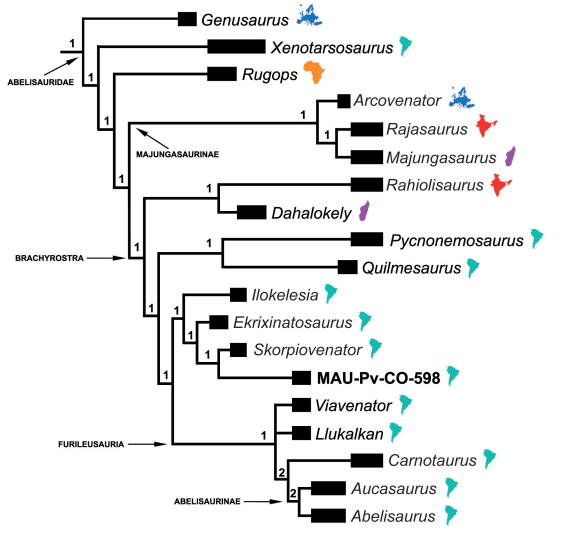 MAU-Pv-CO-598 présente une morphologie particulière, similaire à celle de ses proches parents Skorpiovenator, Ekrixinatosaurus et Ilokelesia, témoin d’une rigidification de sa queue qui devait restreindre ses mouvements. MAU-Pv-CO-598 est un Brachyrostra non-Furileusauria mais date d’après l’évènement de disparition du Turonien. Son existence montre que le renouvellement faunique des abelisauridés, le remplacement des Brachyrostra non-Furileusauria par les Furileusauria, a eu lieu après cet évènement du Turonien. Cette remarque faite par Gianechini et ses collègues modifie ainsi le scénario de dispersion et d’évolution des abelisauridés construit par les études précédentes.