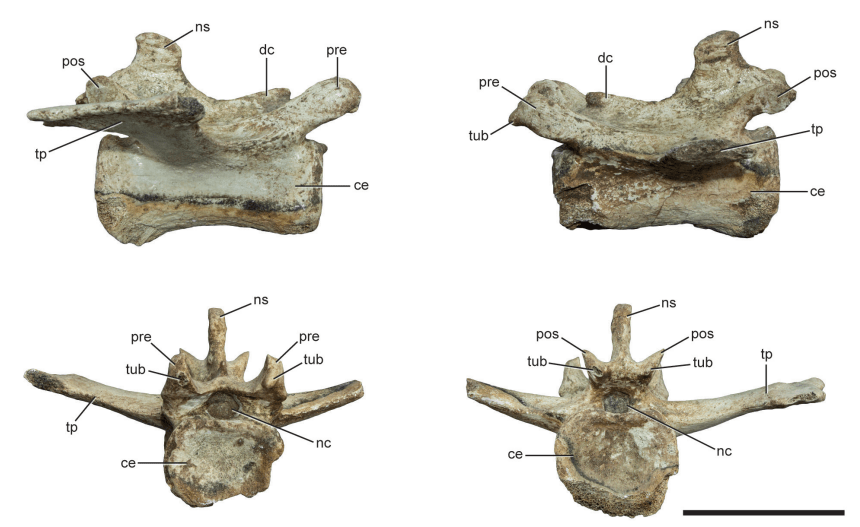 Référence : Gianechini, F.; Filippi, L.; Méndez, A.; Garrido, A., 2022, A non-furileusaurian caudal vertebra from the Bajo de la Carpa Formation (Upper Cretaceous, Santonian) and morphological variation in the tail of Abelisauridae. Publicación Electrónica de la Asociación Paleontológica Argentina. 22(2): 58–70.
