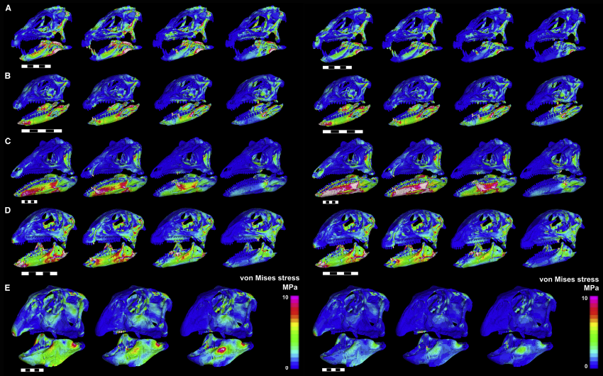 Button et ses collègues ont appliqué les contraintes de von Mises à ces crânes, pour connaître la résistance de celui-ci ainsi que son comportement biomécanique lors d’une morsure. Psittacosaurus est le genre qui subit le moins de stress mécanique lors d’une morsure. Lesothosaurus, Hypsilophodon et Heterodontosaurus présentent des valeurs de stress similaires et enfin, Scelidosaurus est celui qui subit le plus de stress mécanique parmi les genres analysés.