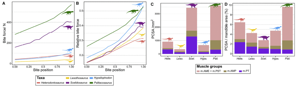 Ainsi, Scelidosaurus présente une force de morsure relative faible, mais une grande force de morsure absolue. Le genre compense ainsi sa faible morsure par sa grande taille, qui implique donc des muscles plus grands. Lesothosaurus possède la force de morsure absolue la plus faible avec une force de morsure relative plutôt basse. Heterodontosaurus présente également une force de morsure relative faible, mais la compense par de puissants muscles de la mâchoire, qui lui permettent d’avoir une force de morsure absolue plutôt élevée. Hypsilophodon et Psittacosaurus ont les plus grandes forces de morsure relative, mais Hypsilophodon possède une force de morsure absolue assez faible par rapport à Psittacosaurus. Hypsilophodon présente une meilleure morsure avec l’arrière de sa mâchoire tandis que Psittacosaurus a une meilleure morsure avec l’avant de sa mâchoire.
