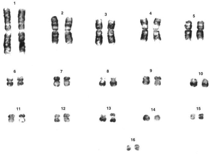Pour ce qui est du caryotype des squamates, celui-ci est assez variable avec entre 16 et 62 chromosomes. Le caryotype des crocodiliens est constitué de 32 macrochromosomes, mais pas de microchromosomes, ce qui est une exception au sein des Sauria actuels. Les oiseaux possèdent quant à eux une moyenne de 80 chromosomes, avec une majorité de microchromosomes.