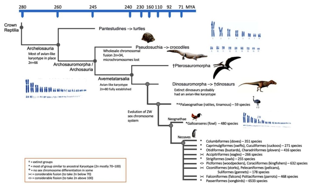 Le caryotype des oiseaux, avec 80 chromosomes en moyenne, a probablement vu le jour après la divergence des pseudosuchiens, c’est-à-dire au sein d’Avemetatarsalia. Cela implique le fait que les ptérosaures et les dinosaures avaient probablement un caryotype similaire. Le système des chromosomes sexuels W et Z que l’on observe chez les oiseaux néognathes ne se retrouve pas chez les oiseaux paléognathes ni chez les autres membres de Sauria. Selon Griffin et ses collègues, il est improbable que les dinosaures non-aviens aient eu des chromosomes sexuels, bien qu’il ne soit pas impossible que ce trait soit apparu chez les avemetatarsaliens et que ce trait ait ensuite disparu chez les paléognathes.