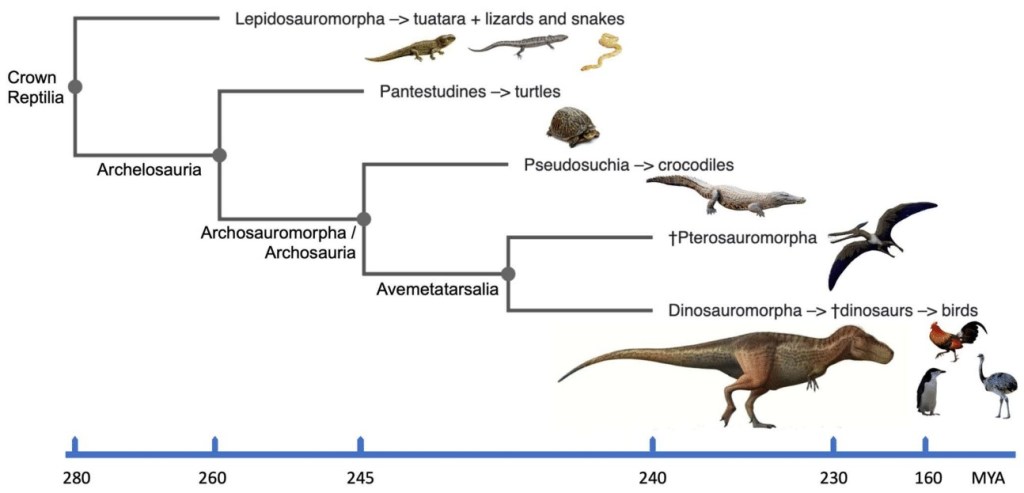 Grâce aux analyses moléculaires et à la phylogénie, il a pu être déterminé que le groupe actuel le plus proche des dinosaures est celui des oiseaux, puisque ceux-ci sont eux même des dinosaures. Ensuite, ce sont les crocodiliens qui leur sont les plus proches, avec un ancêtre commun au sein d’Archosauria, puis les tortues qui partagent un ancêtre commun avec les dinosaures au sein d’Archosauromorpha. Finalement, le groupe le plus éloigné par Griffin et ses collègues, les lepidosaures, partagent un ancêtre commun avec les dinosaures au sein de Sauria. L’époque pendant laquelle ces différents groupes sont apparus et ont divergé des autres est inconnue, mais se situe probablement au début du Permien, vers -280 millions d’années.