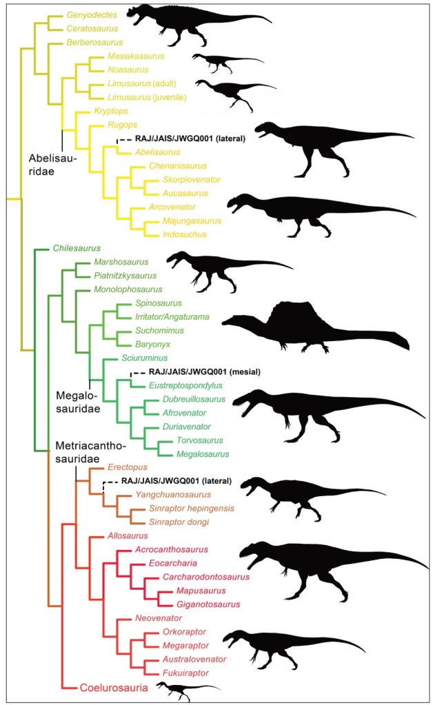 RAJ/JAIS/JWGQ001 est une dent ziphodonte typique de la plupart des théropodes prédateurs. Les observations morphologiques de Sharma et ses collègues les ont conduits à référer FC-DPV 3531 à Abelisauridae indet. Pour identifier le groupe à laquelle appartient cette dent, Sharma et ses collègues ont réalisé une analyse phylogénétique incluant tous les caractères dentaires. Elle a placé RAJ/JAIS/JWGQ001 dans plusieurs positions potentielles : au sein d’Abelisauridae, de Metriacanthosauridae ou de de Megalosauridae. Cette analyse ne comprend que les caractères dentaires et ne correspond pas a la réalité des relations phylogénétiques, mais permet d’éclaircir les relations générales entre les dents des théropodes. Suite à ces résultats, Sharma et ses collègues ont référé RAJ/JAIS/JWGQ001 à Averostra indet.