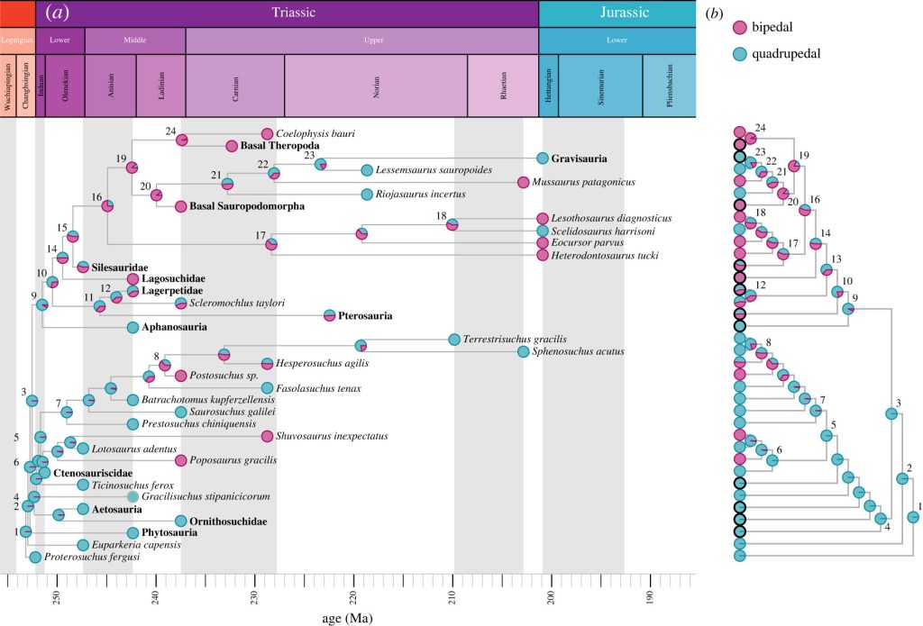 Au sein d’Avemetatarsalia, l’émergence de la bipédie est quelque peu ambiguë. Les aphanosaures basaux sont des quadrupèdes exclusifs. Elle est potentiellement présente chez les pterosauromorphes basaux, mais perdue chez les ptérosaures qui sont des quadrupèdes exclusifs. La bipédie est présente chez la grande majorité des dinosauromorphes basaux, les silesauridés ayant développé la quadrupédie au cours de leur évolution. La bipédie semble ainsi s’être développée chez les Ornithodira ou bien au sein de Dinosauromorpha. Ensuite, plusieurs lignées de dinosaures ont développé un retour à la position quadrupède, comme les sauropodes et une grande majorité des ornithischiens dérivés.