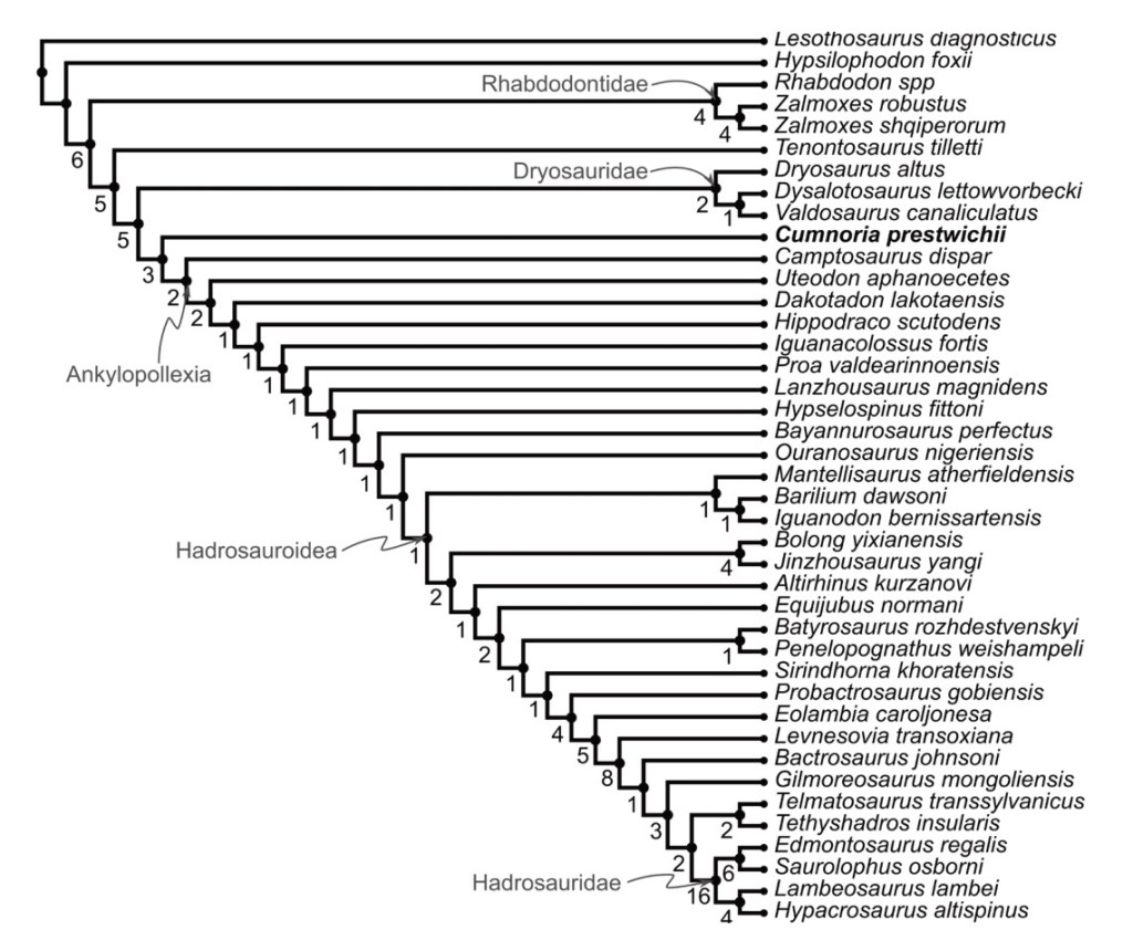 En 1880, Hulke créé la nouvelle espèce Iguanodon prestwichii pour un squelette partiel (OUMNH J.3303) découvert dans le Kimméridgien de la formation géologique de Kimmeridge Clay (Oxfordshire, Angleterre). En 1888, Seeley sépare l’espèce dans son propre genre, qu’il nomme Cumnoria. En 1889, Lydekker synonymise le genre à Camptosaurus, une proposition largement suivie par les études suivantes. En 2008, Naish et Martill redécrivent OUMNH J.3303 et considèrent que son attribution à Camptosaurus n’est pas solide, et suggèrent une résurrection du genre Cumnoria. Les études suivantes ont semblé supporter la validité de Cumnoria, mais n’ont pas inclus le genre dans des analyses phylogénétiques. C’est pour connaître les relations phylogénétiques et pour tester la validité de Cumnoria que Maidment et ses collègues ont entrepris de redécrire le genre.