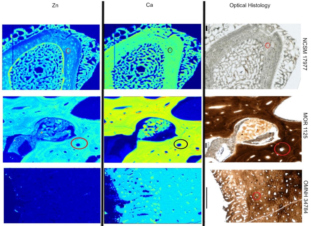 Anné et ses collègues ont analysé un fragment de fémur de MOR 1125 avec un synchrotron utilisant la fluorescence des rayons X. Ils ont comparé leurs résultats avec ceux de l’analyse d’un os d’oiseau actuel (un radius de cacatoès, NCSM 17977) et d’un tibia de Tenontosaurus (OMNH 34784). La réaction des éléments chimiques face au rayonnement X projeté par l’action du synchrotron permet de les identifier.
