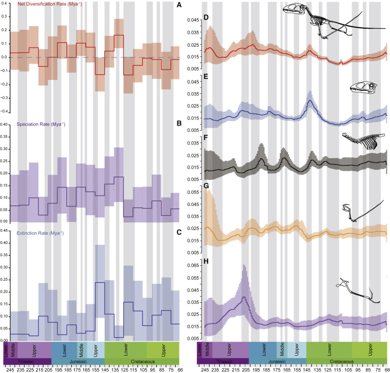 Afin d’analyser quantitativement l’évolution des ptérosaures, Yu et ses collègues ont compilé des analyses phylogénétiques avec des analyses de taille corporelle, de taux de diversification, de taux morphologiques et de disparité morphologique. Ces analyses ont mis en évidence deux phases principales dans l’évolution des ptérosaures : une période florissante du trias au crétacé inférieur, et une période de déclin du crétacé inférieur à la fin du crétacé. Les premiers 115 millions d’années de l’histoire évolutive des ptérosaures est caractérisée par des taux de diversification positifs. Au contraire, les derniers 65 millions d’années de leur histoire évolutive est caractérisée par des taux de diversification négatifs. Yu et ses collègues remarquent également que l’augmentation de la masse corporelle n’est pas liée à une augmentation de la diversité ni de la disparité morphologique.