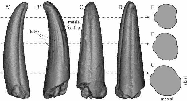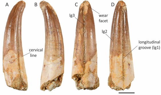 Référence : Smith, R.E.; Martill, D.E., 2023, An unusual dental pathology in a tooth of Spinosaurus (Dinosauria, Theropoda) from the mid-Cretaceous of Morocco. Cretaceous Research. 105499.