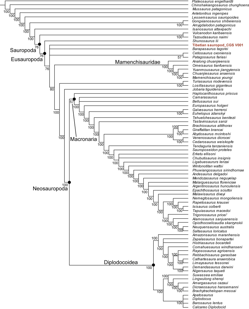 An et ses collègues ont réalisé une analyse phylogénétique pour connaître la position du Tibetian Sauropod parmi les sauropodes. Ils le classent comme un eusauropode basal, plus dérivé que Shunosaurus mais plus basal que les mamenchisauridés. Toutefois, ces résultats sont peut-être biaisés par la nature juvénile de CGS V001. En effet, An et ses collègues pensent que CGS V001 est probablement un mamenchisauridé juvénile, mais l’ontogénèse des mamenchisauridés est encore trop mal connue pour en être certain. Ainsi, ils décident prudemment de référer CGS V001 à Eusauropoda indet.