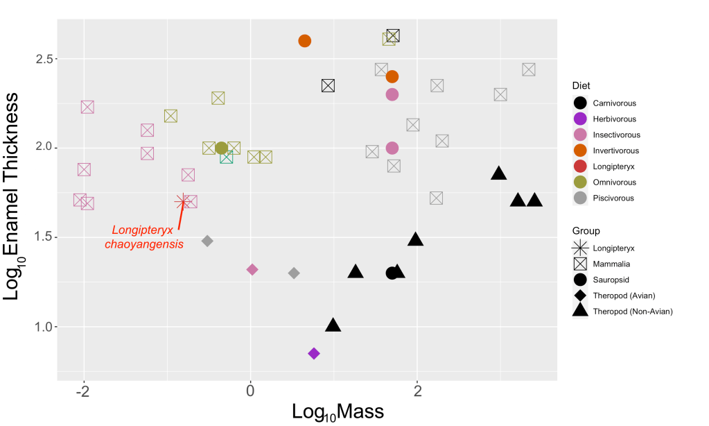 Clark et ses collègues notent que Longipteryx présente un émail des dentaire exceptionnellement épais rapport aux autres oiseaux du Crétacé pourvus de dents mais aussi par rapport aux théropodes Anchiornis et Microraptorinae. L’émail des dents de Longipteryx est en revanche similaire à celui des molaires de chauves-souris insectivores. Les dents de Longipteryx sont similaires aux canines de plusieurs mammifères carnivores, aux dents maxillaires des sauropsides carnivores, aux canines de chauves-souris insectivores et aux dents maxillaires du tuatara insectivore. Elle indique également que les dents de Longirostravis sont similaires aux canines de plusieurs mammifères carnivores, aux dents maxillaires des sauropsides carnivores et aux canines de chauves-souris insectivores.