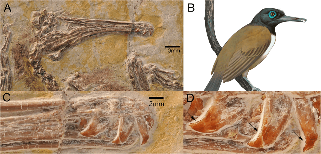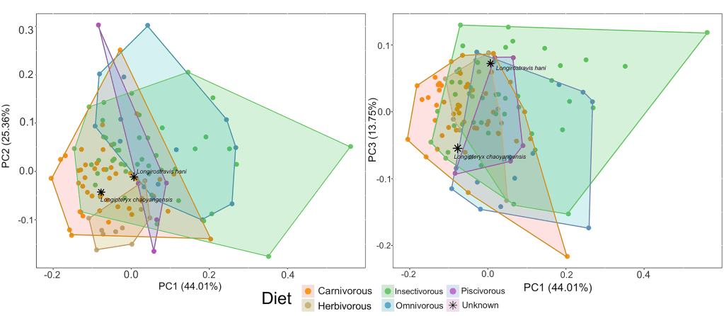 Références : Clark, A.D.; Hu, H.; Benson, R.B.; O’Connor, J.K., 2023, Reconstructing the dietary habits and trophic positions of the Longipterygidae (Aves: Enantiornithes) using neontological and comparative morphological methods. PeerJ. 11: e15139.