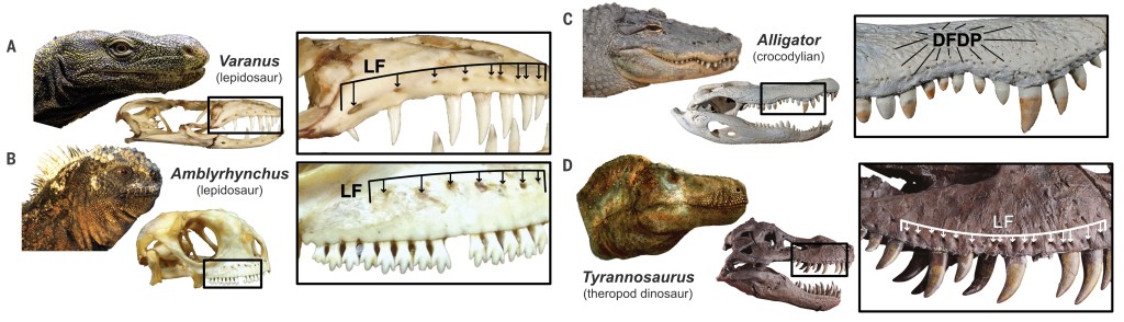 La présence de tissus extra-oraux de type « lèvres » chez les tétrapodes peut être attestée par l’étude de la densité des foramens disposés sur les mâchoires. Cullen et ses collègues ont démontré que le motif formé par les foramina sur les mâchoires des théropodes est plus similaire dans sa structure au motif observé chez de nombreux squamates actuels, qu’au motif observé chez les crocodiliens actuels. Cette similitude avec les squamates dotés de tissus extra-oraux tend en faveur de l’hypothèse de théropodes pourvus de « lèvres ».