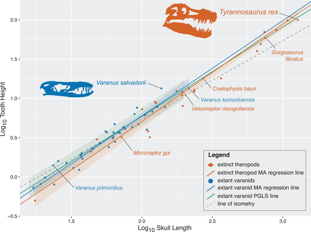 Bien que les crânes et les dents des dinosaures théropodes soient en effet très grands par rapport à ceux des sauropsides existants, Cullen et ses collègues montrent que ces tailles restent proportionnelles à celles observées pour les varans actuels. Même le varan avec les dents proportionnellement les plus grandes (Varanus salvadorii) n’a pas de dentition exposée à l’air libre, et présente des tissus extra-oraux. Le rapport hauteur des dents/longueur du crâne de Varanus salvadorii est plus élevé que pour le plus grand théropode analysé (Tyrannosaurus rex). Cullen et ses collègues démontrent ainsi que les dents des théropodes n’étaient pas trop grandes pour être recouvertes de tissus extra-oraux de type « lèvres ».