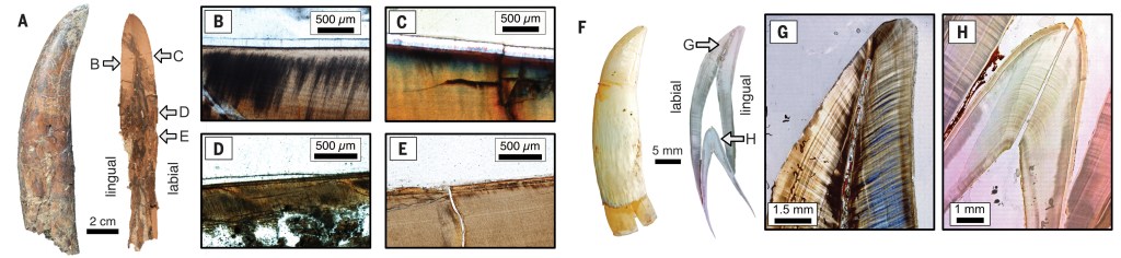 Cullen et ses collègues ont ensuite étudié l’ostéohistologie d’une dent du théropode tyrannosauridé Daspletosaurus. Ils ont établi que cette dent était pleinement développée, présente depuis bien plus d’un an sur la mâchoire de l’animal. Ils ont observé que l’émail de la dent ne présentait pas de signes d’usure, avec une épaisseur similaire sur les côtés lingual et labial. Pour comparer leurs résultats, ils ont aussi analysé une dent du crocodilien Alligator. Cette dent est érodée sur le côté labial exposé à l’extérieur de la mâchoire.