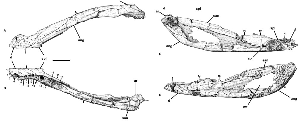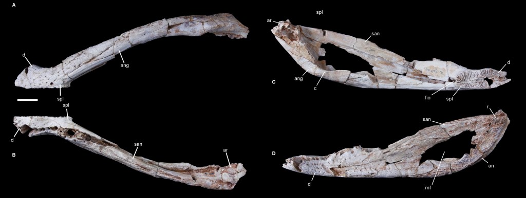Références : Pochat-Cottilloux, Y.; Perrier, V.; Amiot, R.; Martin, J.E., 2023, A peirosaurid mandible from the Albian–Cenomanian (Lower Cretaceous) of Algeria and the taxonomic content of Hamadasuchus (Crocodylomorpha, Peirosauridae). Papers in Palaeontology. 9(2): e1485.