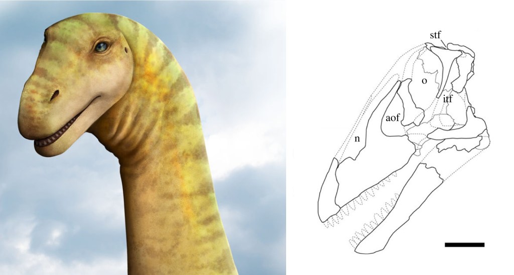 Références : Poropat, S.F.; Mannion, P.D.; Rigby, S.L.; Duncan, R.J.; Pentland, A.H.; Bevitt, J.J.; Sloan, T.; Elliott, D.A., 2023, A nearly complete skull of the sauropod dinosaur Diamantinasaurus matildae from the Upper Cretaceous Winton Formation of Australia and implications for the early evolution of titanosaurs. Royal Society Open Science. 10(6): 221618.