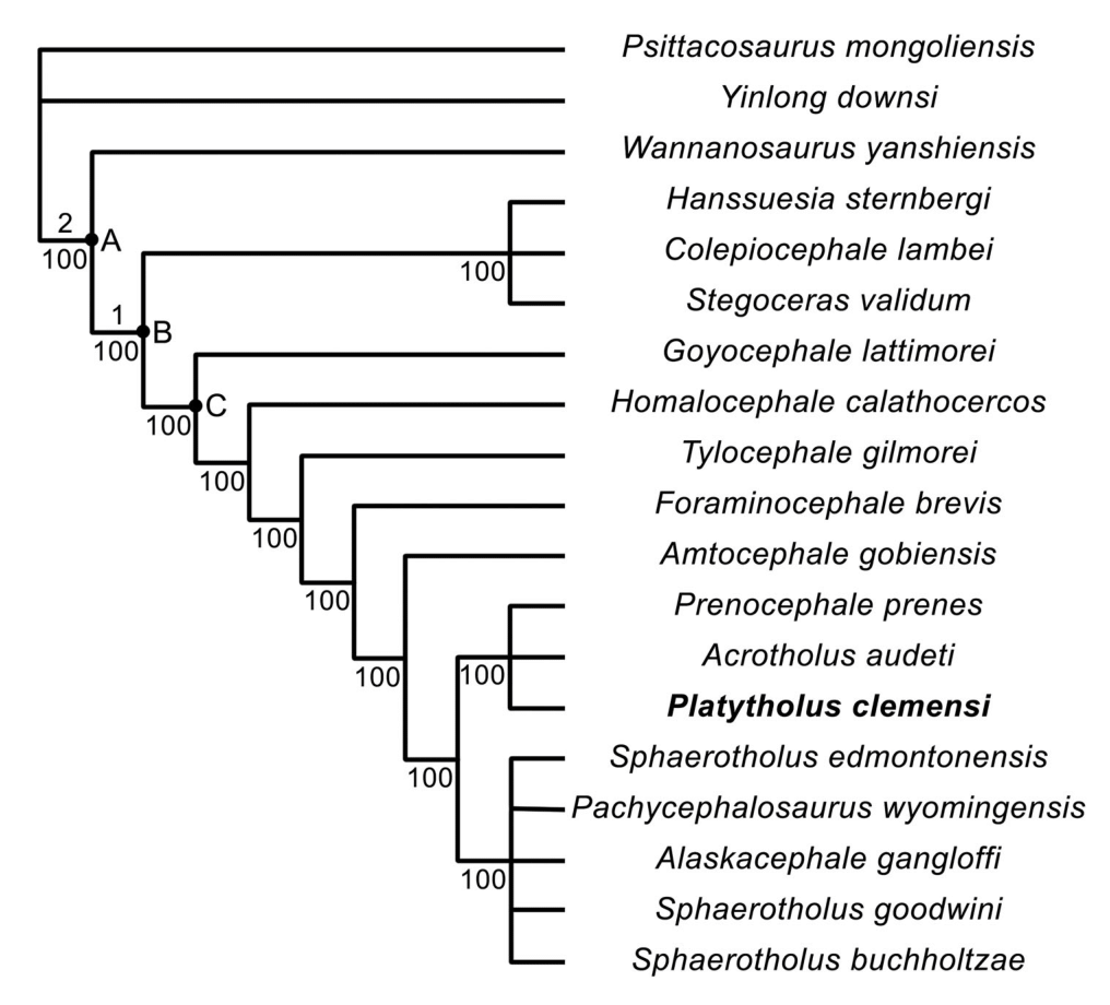 L’holotype (MOR 2915) de Platytholus clemensi est un dôme partiel, qui comprend une grande partie du toit crânien. Horner et ses collègues ont analysé les sutures osseuses du spécimen et effectué une analyse ostéohistologique, qui ont révélé que MOR 2915 était un individu subadulte proche de l’âge adulte.