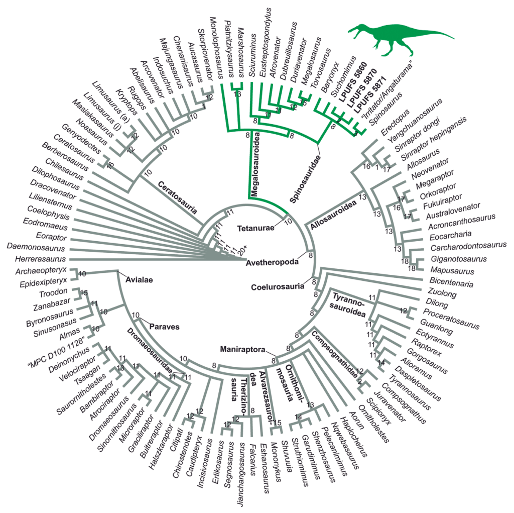 Pour compléter leur analyse morphologique, Lacerda et ses collègues ont réalisé une analyse phylogénétique ainsi qu’une analyse morphométrique. Les résultats de l’analyse phylogénétique placent LPUFS 5860, LPUFS 5870 et LPUFS 5871 au sein de Spinosauridae, toutes trois formant un clade. Cela semble confirmer le fait que ces dents représentent un seul morphotype dentaire de spinosauridé, et donc un seul et unique taxon. L’analyse morphométrique place LPUFS 5860, LPUFS 5870 et LPUFS 5871 dans le morphospace des dents des spinosauridés. Suite à l’ensemble de ces analyses, Lacerda et ses collègues réfèrent LPUFS 5860, LPUFS 5870 et LPUFS 5871 à Baryonychinae indet.