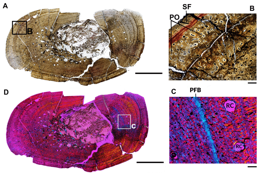 Référence : Andrade, R.C.L.P.; Sena, M.V.A.; Brum, A.S.; Campos, D.A.; Kellner, A.W.A.; Bantim, R.A.M.B.; Sayão, J.M., 2023, Osteohistology of the big-sized cretaceous crocodylomorph Stratiotosuchus maxhechti (Notosuchia, Baurusuchidae) indicates fast growth and niche partitioning with medium-sized theropods. Journal of South American Earth Sciences.