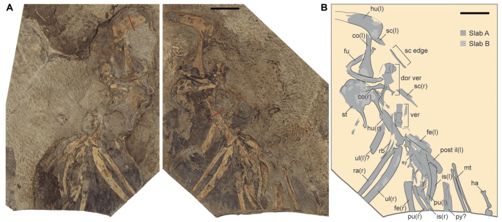 Le spécimen décrit par Nebreda et ses collègues est un squelette partiel (MUPA-LH-33333) conservé sous forme d’empreinte et contre-empreinte. Il se compose de vertèbres, du sternum, de la furcula, d’éléments des membres ainsi que des ceintures scapulaire et pelvienne partielles. Le squelette préserve également des tissus mous comprenant des restes fossilisés de tendons, de peau et de plumes. Nebreda et ses collègues ont effectué une analyse ostéohistologique de MUPA-LH-33333, révélant qu’il s’agit d’un individu subadulte ou adulte.