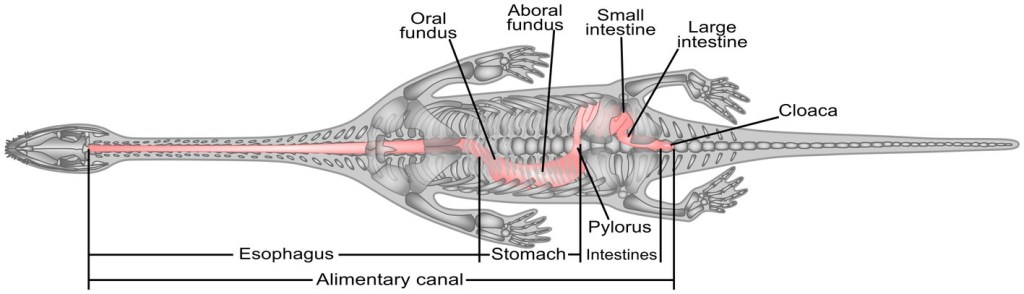 Li et ses collègues ont remarqué que dans le spécimen PCGU4281, le contenu gastro-intestinal occupe beaucoup de place, représentant potentiellement un très gros repas. Cela suggérerait que, lorsque Keichousaurus mangeait de grandes quantités de nourriture à la fois, l’œsophage et l’estomac pouvaient avoir servi de compartiments de stockage jusqu’à ce que la nourriture soit suffisamment digérée. Li et ses collègues ont également pu reconstruire le système digestif de Keichousaurus en se basant sur la morphologie des contenus stomacaux ainsi que de restes de tissus mous. Il comprend quatre régions, l’œsophage, l’estomac, les intestins et le cloaque, dans une disposition très similaire à celle des sauropsides carnivores actuels.
