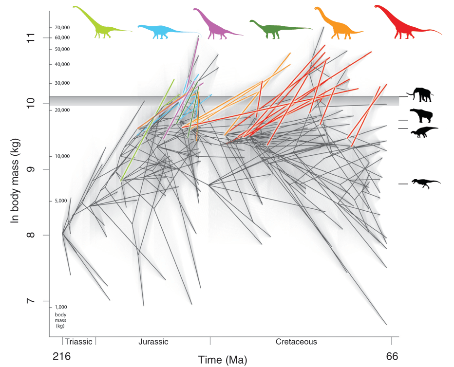 D’Emic constate que 36 lignées de sauropodes ont indépendamment dépassé les masses corporelles développées chez d’autres clades terrestres. Il s’agit de deux lignées de sauropodes non-neosauropodes, deux lignées de Turiasauria, 7 lignées de Diplodocoidea, 7 lignées de Macronaria, y compris trois de Brachiosauridae et 15 de Titanosauria. D’Emic signale qu’il n’y a pas de relation entre la température moyenne mondiale et la masse corporelle chez les sauropodes. Ce résultat suggère que le climat n’a pas été un moteur important de l’évolution de la masse corporelle des sauropodes.